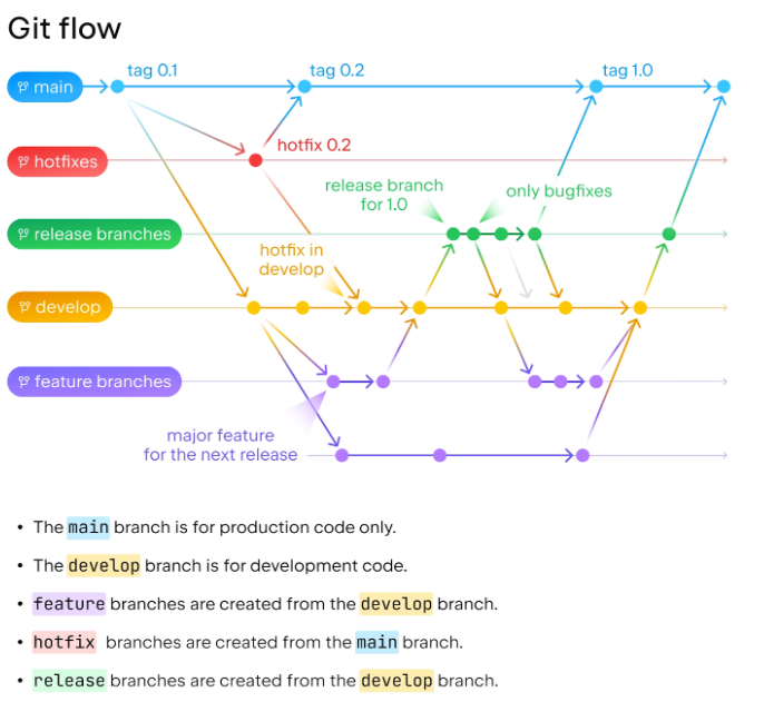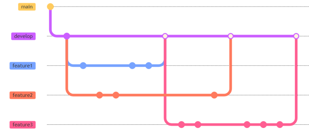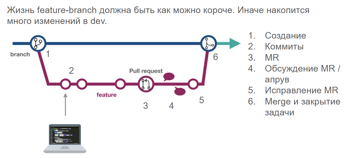 feature-branch / ticket-branch - ветка, унаследованная от develop в которую вносятся точечные изменения, например добавление фичи, исправление бага. Тикет бранчи именуются с номером соответствующего тикета/задачи. Так можно по названию ветки найти задачу и понять цель изменений. И наоборот: по тикету найти ветку. В этой ветке может существовать частично нерабочее состояние репозитория.
